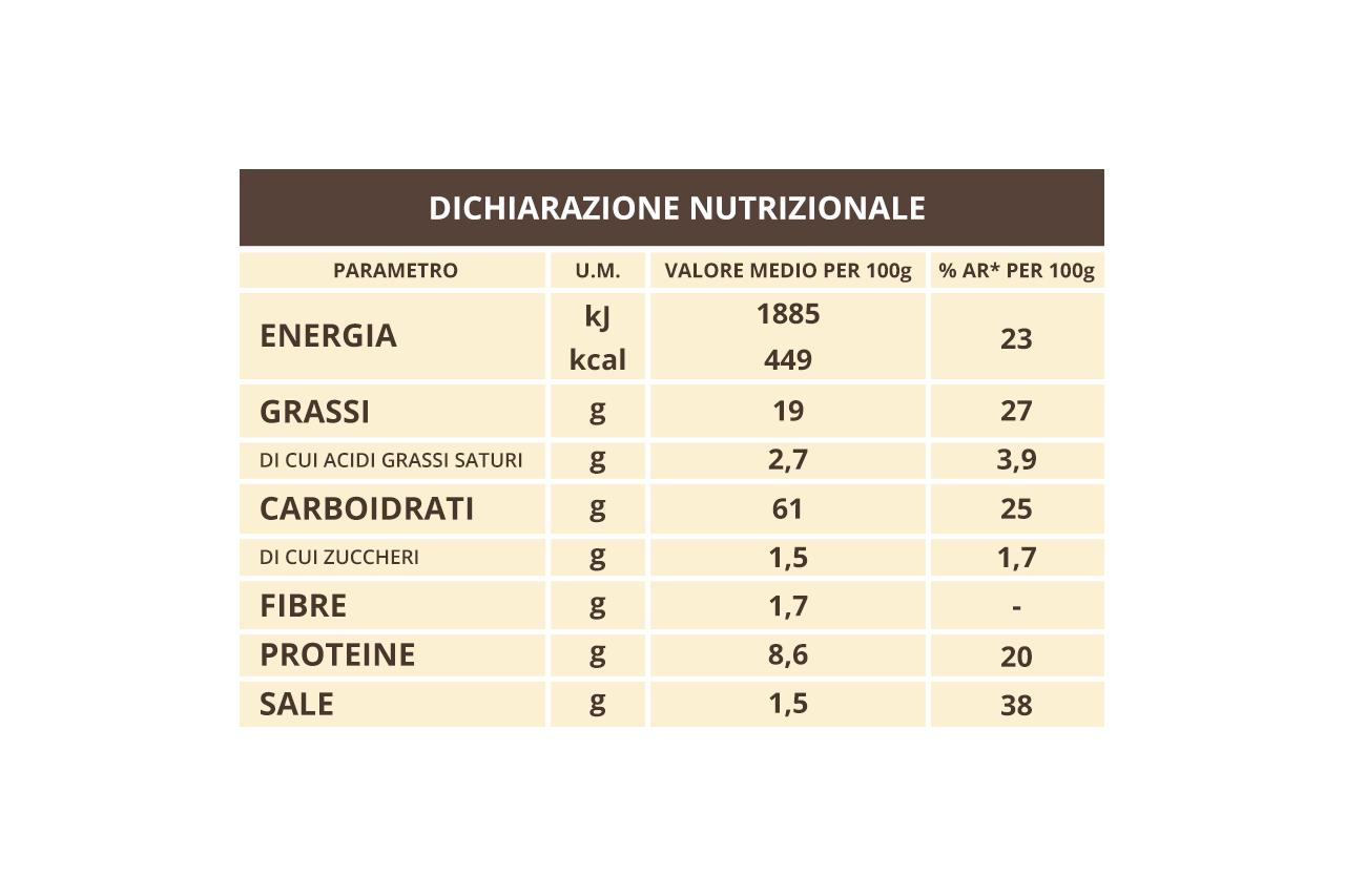 Ingredienti: farina di GRANO tenero tipo 1 pugliesepugliese (25,5%), farina di segale integrale, farina di avena integrale, farina di orzo integrale, farina di farro integrale, semi di lino, semi di sesamo(25,5%), vino bianco pugliese (16%)(SOLFITI), Semola integrale di GRANO duro del Senatore Cappelli(12,7%), olio di oliva (9,5%), olio extravergine di oliva(6,4%), acqua  (3,2%), sale(1,3%), lievito fresco(0,06%);